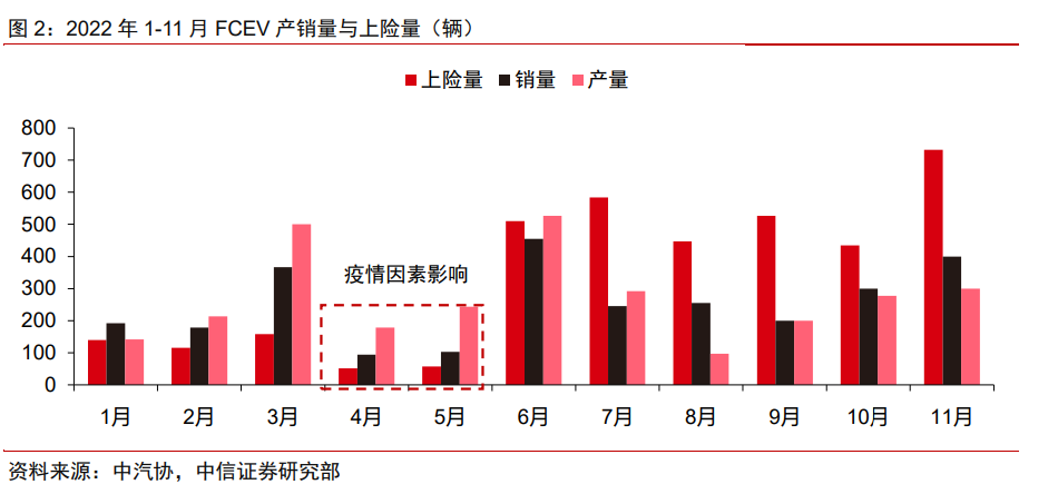 根據(jù)中汽協(xié)以及中信保數(shù)據(jù),2022年前11月FCEV產(chǎn)量為2969輛,銷量為2789輛,上險總數(shù)為3755輛。2022年上半年產(chǎn)量一直大于銷量,主要系2021年下半年確定燃料電池示范城市群政策,業(yè)內(nèi)熱情與預期較高。