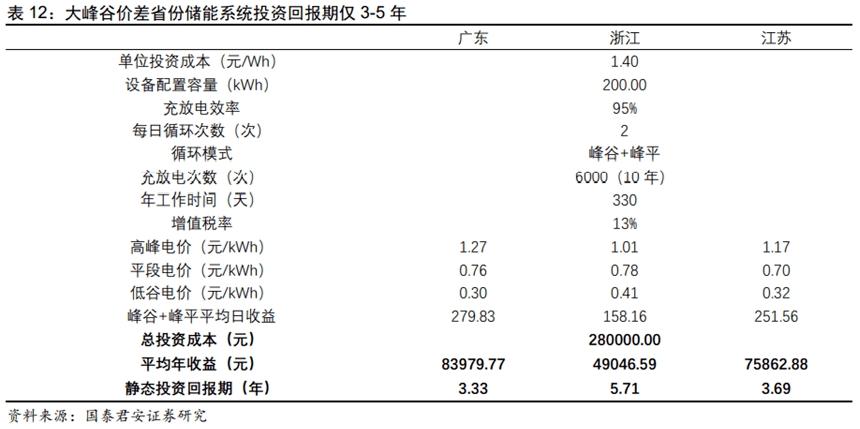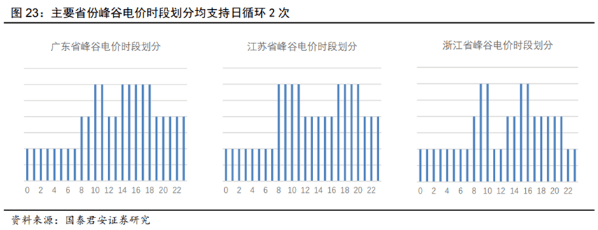 國內用戶側的峰谷電價差套利,我們認為主要體現(xiàn)在小工業(yè)和商業(yè)。按照地區(qū)分布,主要是長三角和珠三角。儲能裝置的經濟性體現(xiàn)在兩峰兩谷(平),每天可以有效充放電兩次的區(qū)域,比如廣東、浙江、江蘇等。