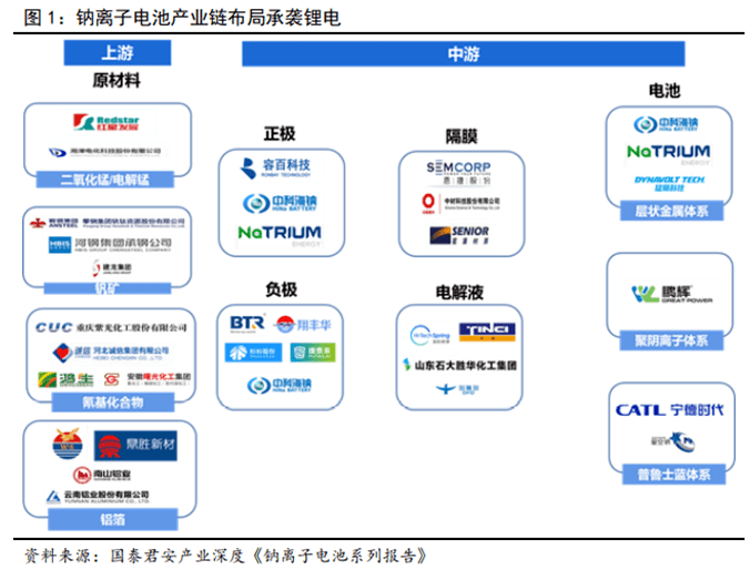 鈉電產業(yè)鏈布局承襲鋰電,利于產業(yè)化快速導入。我國鈉離子電池產業(yè)鏈還處于初級階段,產業(yè)布局尚不成熟。鈉離子電池產業(yè)鏈結構與鋰電類似,包括上游資源企業(yè)、中游電池材料及電芯企業(yè)。