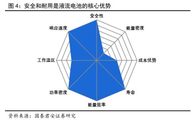 液流電池具備兩大核心優(yōu)勢(shì):1)安全:從根本上避免爆燃,2)耐用:活性物質(zhì)衰減緩慢,工作壽命長(zhǎng)達(dá)15-20年,加之儲(chǔ)能系統(tǒng)一般是靜態(tài)設(shè)施,對(duì)重量、體積的要求不高,能量密度并非關(guān)鍵指標(biāo),使得其尤其適合作為大規(guī)模儲(chǔ)能系統(tǒng)。