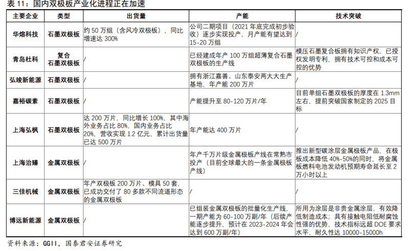 國內(nèi)產(chǎn)業(yè)化進(jìn)程正在加速:據(jù)GGII統(tǒng)計(jì),2021年期間,國內(nèi)主流雙極板企業(yè)出貨量增長顯著,金屬雙極板領(lǐng)域已出現(xiàn)單個(gè)企業(yè)單個(gè)客戶出貨達(dá)百萬片級(jí)別的現(xiàn)象;石墨板市場各家出貨也均有較大增長,表現(xiàn)明顯的是原萬片級(jí)出貨企業(yè)的出貨量級(jí)達(dá)到10萬片以上,頭部企業(yè)的出貨更是達(dá)到了50萬片/年以上。