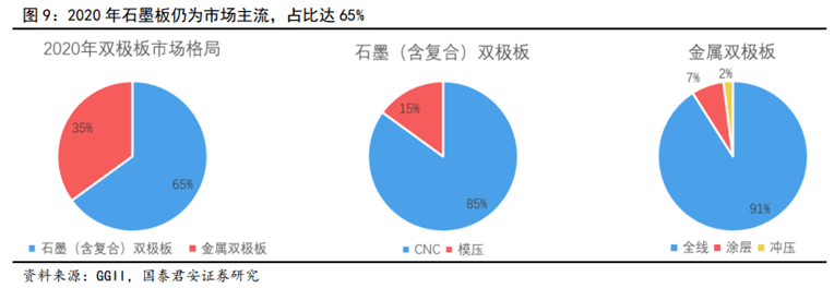 市場格局:仍以石墨板為主,金屬板或后來居上。氫燃料電池方面,2020年我國氫燃料電池雙極板市場規(guī)模達(dá)3.1億元,石墨板(包含碳塑復(fù)合板)和金屬板的市場占比分別為65%和35%,2021年石墨雙極板與金屬雙極板趨于平分秋色。GGII數(shù)據(jù)顯示,2021年H1金屬雙極板出貨量在雙極板總出貨量的占比已達(dá)45.0%(2020年同期為36.0%)。釩液流電池方面,基本不考慮金屬板,即使是涂層處理后的金屬板,在酸性液體環(huán)境中也難以長期穩(wěn)定工作。石墨雙極板(機(jī)加工)不被看好,因?yàn)槠錂C(jī)加工過程復(fù)雜且成本高。釩液流電池主要采用碳塑復(fù)合板,因?yàn)槠錈崴芑蚰汗に囅鄬?duì)機(jī)加工簡單,但是混合高分子樹脂所帶來的電阻率增加仍是需要解決的問題。