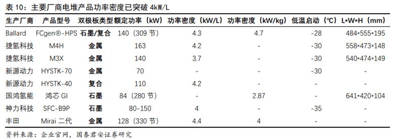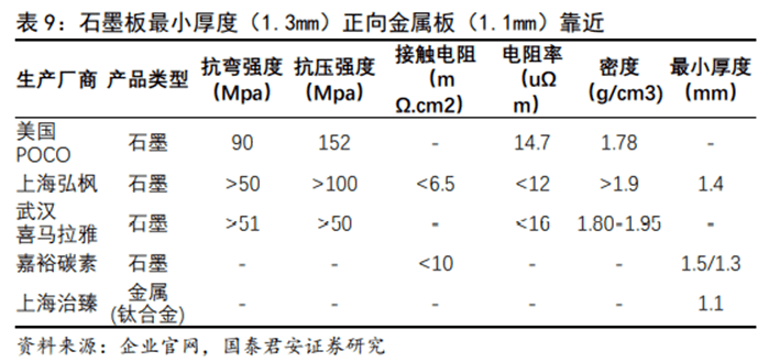石墨板適應(yīng)需求趨于薄型化,乘用車為金屬板帶來機(jī)遇。石墨板:由于其高耐腐蝕性、高耐久性,以及相對(duì)較低的技術(shù)壁壘,率先實(shí)現(xiàn)國產(chǎn)化,在對(duì)體積較不敏感而對(duì)耐久性敏感的特種車、商用車領(lǐng)域示范應(yīng)用。然而,石墨雙極板的制作周期長、機(jī)械性能差、加工難度大、制作成本高等劣勢也不可忽視。市場已有越來越多的企業(yè)成功開發(fā)出超薄超精細(xì)石墨雙極板,提前突破了國家制定2025年前單組石墨雙極板厚度1.5mm的要求,功率密度開始接近豐田第一代金屬雙極板的水平。金屬板:抗腐蝕性差,壽命過短是其應(yīng)用的阻礙,然而隨著涂層工藝的持續(xù)進(jìn)步與突破,其有望實(shí)現(xiàn)和石墨板相同的使用壽命。豐田汽車公司率先在旗下Mirai燃料電池汽車上使用金屬雙極板和涂層,解決了腐蝕、成本和導(dǎo)電等一系列問題。憑借其機(jī)械性能優(yōu)異、高體積功率密度、成本低廉且易批量生產(chǎn)等優(yōu)勢,金屬雙極板將在乘用車規(guī)?;瘧?yīng)用的進(jìn)程中實(shí)現(xiàn)突破。