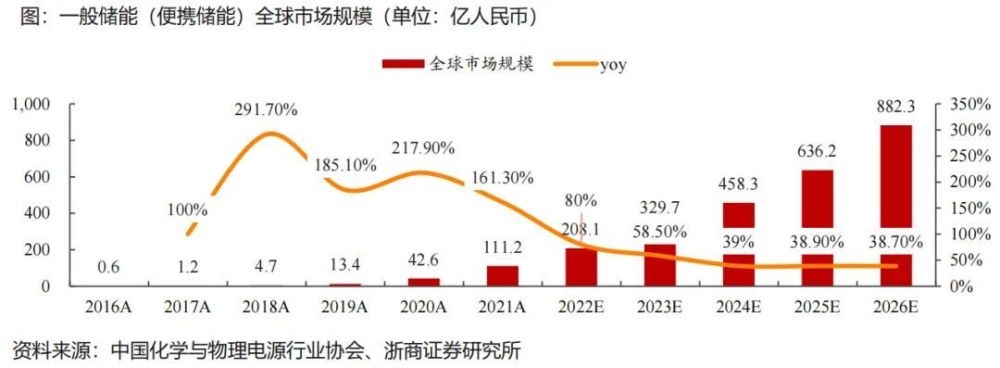 一般儲(chǔ)能/便攜儲(chǔ)能:適用于①戶外旅行場(chǎng)景,為手機(jī)/電腦等供電,滿足戶外旅行多樣化便攜需求;②應(yīng)急備災(zāi)等場(chǎng)景,在地震、海嘯多發(fā)地區(qū),可與太陽能電板構(gòu)成小型發(fā)電系統(tǒng),滿足災(zāi)民用電需求。根據(jù)中國化學(xué)與物理電源行業(yè)協(xié)會(huì)數(shù)據(jù),預(yù)計(jì)至2026年市場(chǎng)規(guī)模有望達(dá)882億人民幣。具體如下圖所示: