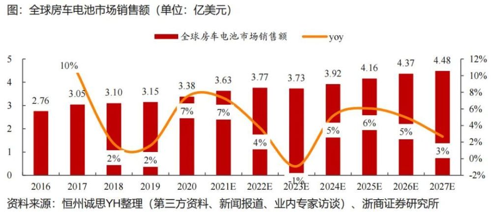 房車儲(chǔ)能:鉛酸電池儲(chǔ)能系統(tǒng)相對(duì)成熟,已被成品房車大量使用;近幾年趨勢(shì)會(huì)加配折疊太陽能電池板,備用發(fā)電。根據(jù)恒州誠思數(shù)據(jù),預(yù)計(jì)2026年房車用電池市場(chǎng)銷售額4.37億美元;伴隨儲(chǔ)能系統(tǒng)迭代升級(jí),房車儲(chǔ)能有較大機(jī)會(huì)。具體如下圖所示: