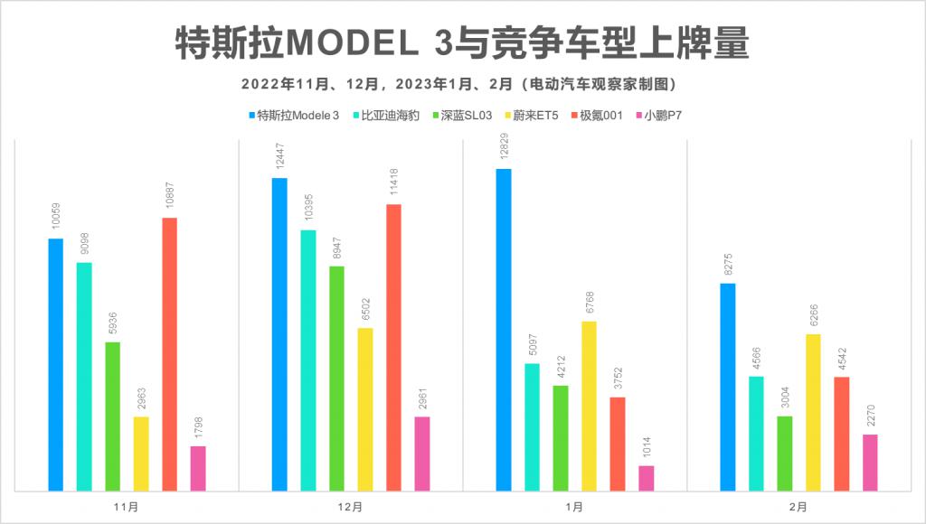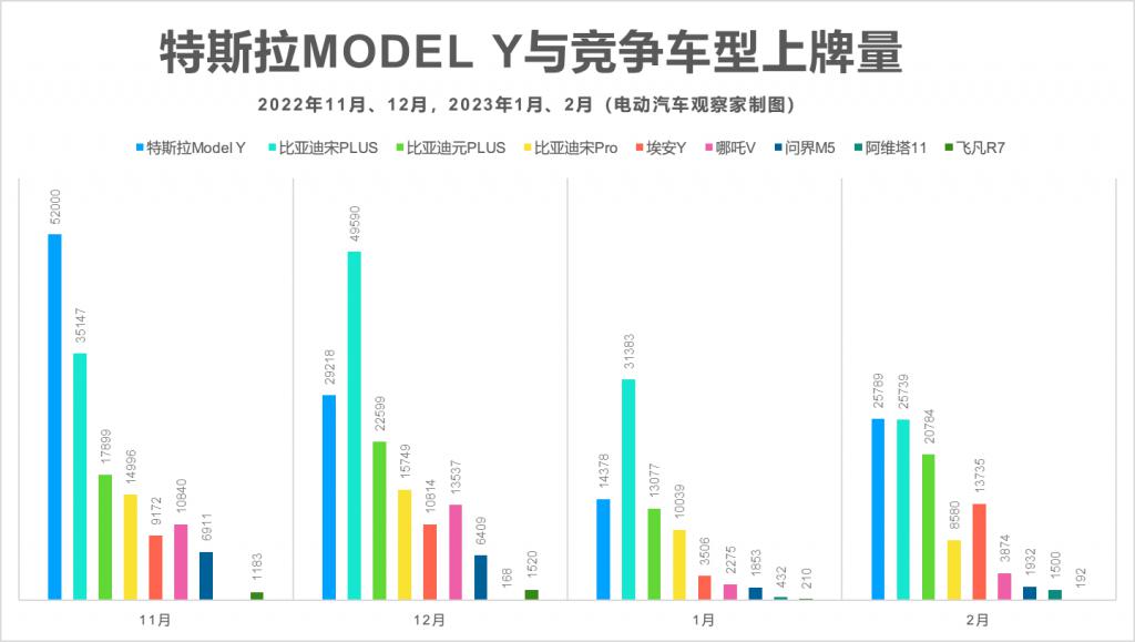 通過 1 月份 4 萬元左右的降幅,Model Y 在 2 月份開始回到 " 月銷 3 萬 " 的趨勢當中,并對競爭對手產(chǎn)生了連鎖反應: