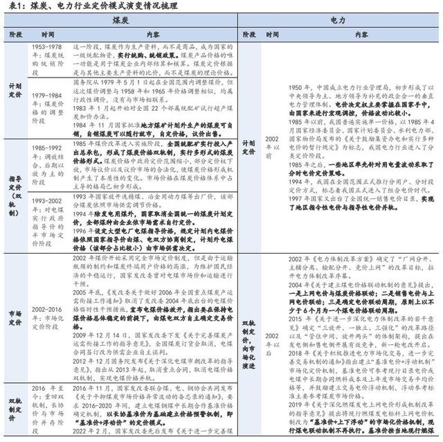 煤電矛盾的本質(zhì)是煤、電定價(jià)機(jī)制市場(chǎng)化程度不同。煤炭定價(jià)方面,2016 年以前我國(guó)煤炭?jī)r(jià)格經(jīng)歷了計(jì)劃價(jià)格、指導(dǎo)價(jià)格、市場(chǎng)價(jià)格等多種定價(jià)機(jī)制。2016 年末國(guó)家發(fā)改委聯(lián)合煤、電、鋼協(xié)會(huì)共同發(fā)布《關(guān)于平抑煤炭市場(chǎng)價(jià)格異常波動(dòng)的備忘錄的通知》,要求 2016-2020 年間,建立電煤鋼煤中長(zhǎng)期合作基準(zhǔn)價(jià)格確定機(jī)制,以長(zhǎng)協(xié)基準(zhǔn)價(jià)為基礎(chǔ)建立價(jià)格預(yù)警機(jī)制,即“基準(zhǔn)價(jià)+浮動(dòng)價(jià)”的定價(jià)模式。電力定價(jià)方面,2015 年國(guó)家開啟電力定價(jià)機(jī)制市場(chǎng)化改革,2020 年取消“煤電聯(lián)動(dòng)”機(jī)制,同時(shí)將燃煤發(fā)電標(biāo)桿上網(wǎng)電價(jià)機(jī)制改為“基準(zhǔn)價(jià)+上下浮動(dòng)”的市場(chǎng)化價(jià)格機(jī)制,基準(zhǔn)價(jià)格設(shè)定權(quán)下放至地方政府,浮動(dòng)幅度由電力用戶等市場(chǎng)主體協(xié)商決定。