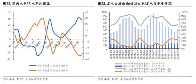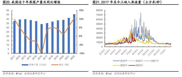 確保能源安全穩(wěn)定供應(yīng),煤電扛起保供重任。2023 年 4 月《2023 年能源工作指導(dǎo)意見》發(fā)布,不同于 2021 年指導(dǎo)意見中將“能源結(jié)構(gòu)”放在了目標(biāo)首位,國(guó)家能源局已經(jīng)連續(xù)兩年堅(jiān)持把“增強(qiáng)供應(yīng)保障能力”放在主要目標(biāo)首位。由此可見,自 2021 年起頻發(fā)的缺電事件使人們意識(shí)到能源保供需求刻不容緩,而我國(guó)以煤為主的資源稟賦,決定了煤電在相當(dāng)長(zhǎng)時(shí)期內(nèi)仍將承擔(dān)保障我國(guó)能源安全的重要作用。從數(shù)據(jù)來看,煤炭方面,在能源保供要求下國(guó)家通過核增產(chǎn)能、擴(kuò)產(chǎn)、新投產(chǎn)等方式持續(xù)新增煤炭產(chǎn)能,據(jù)國(guó)家統(tǒng)計(jì)局,2022 年我國(guó)實(shí)現(xiàn)煤炭產(chǎn)量 45.6 億噸,同比增長(zhǎng) 10.5%,為近十年來最高增速。煤電方面,去年夏季以來,降水偏枯造成水電發(fā)電量持續(xù)出力不足,2022 年下半年至 2023 年上半年三峽水庫日均流入量為近五年來同期低位,據(jù)國(guó)家統(tǒng)計(jì)局,2023 年 1-6 月我國(guó)水力發(fā)電量同比下降 22.9%。為彌補(bǔ)水力發(fā)電不足,2023 年 1-6 月我國(guó)火力絕對(duì)發(fā)電量達(dá)到 29457 億千瓦時(shí),同比增長(zhǎng) 7.5%,占上半年總發(fā)電量的 71%。