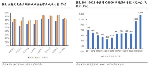 據(jù)煤炭資源網(wǎng),2021 年秦皇島港動(dòng)力煤 Q5500 平倉價(jià)中樞達(dá)到 1029 元/噸,較 2020 年價(jià)格中樞 568 元/噸上漲約 81%。2022 年,在俄烏沖突、極端高溫天氣、煤炭新增產(chǎn)能釋放有限等多重因素影響下,煤價(jià)持續(xù)高位運(yùn)行,秦皇島港動(dòng)力混煤 Q5500 平倉價(jià)全年價(jià)格中樞抬升至1268 元/噸,同比提高約 23%,直接導(dǎo)致 2021-2022 年火電企業(yè)燃料成本占比大幅提升,火電企業(yè)業(yè)績(jī)承壓。