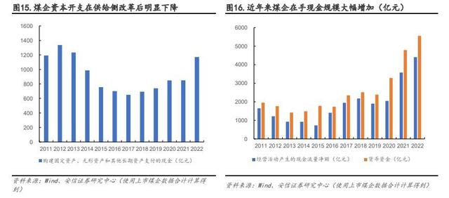 “雙碳”目標(biāo)下,煤企轉(zhuǎn)型具備先天產(chǎn)業(yè)優(yōu)勢(shì)、地域優(yōu)勢(shì)且資金充足。一方面,煤企具有產(chǎn)業(yè)優(yōu)勢(shì),具備能源開采、裝備制造的成熟經(jīng)驗(yàn),擁有穩(wěn)定的下游電廠、化工客源,以及先天地域優(yōu)勢(shì)。我國(guó)大型新能源項(xiàng)目基地多數(shù)位于西北地區(qū),與煤炭資源分布重合度較高,如我國(guó)第一批容量約 1 億千瓦的大型風(fēng)電光伏基地主要位于甘肅、青海、內(nèi)蒙、寧夏等西部地區(qū)。此外,與傳統(tǒng)能源相比,新能源占地面積大。隨著新能源規(guī)模快速擴(kuò)大,土地資源已經(jīng)成為影響新能源發(fā)展的重要因素,煤炭企業(yè)可利用自有采煤沉陷區(qū)受損土地規(guī)劃建設(shè)光伏發(fā)電、風(fēng)力發(fā)電等新能源項(xiàng)目,提高資源利用率的同時(shí)還可實(shí)現(xiàn)綠色轉(zhuǎn)型。另一方面,受制于 2011-2013 年行業(yè)產(chǎn)能過剩以及 2016 年以來的供給側(cè)結(jié)構(gòu)性改革,煤炭行業(yè)資本開支明顯下降,2021 年至今雖在行業(yè)景氣度好轉(zhuǎn)以及政策鼓勵(lì)保供穩(wěn)價(jià)背景下有所回升,但在“雙碳”目標(biāo)持續(xù)推進(jìn)下,煤炭固定資產(chǎn)投資規(guī)模大、時(shí)間長(zhǎng),資本開支仍低于此前水平,且新礦井的使用時(shí)間一般長(zhǎng)達(dá)數(shù)十年之久,長(zhǎng)期來看與雙碳背景相違背,企業(yè)進(jìn)行煤炭固定資產(chǎn)投資的意愿不強(qiáng)。但近兩年煤價(jià)高位運(yùn)行,使得煤炭企業(yè)盈利能力持續(xù)改善,在手現(xiàn)金規(guī)模大幅增加,為后續(xù)轉(zhuǎn)型提供基礎(chǔ)。