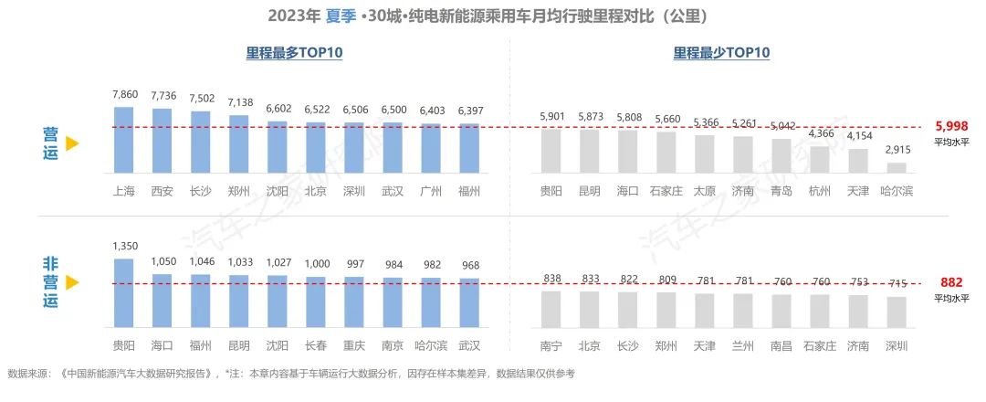 30個(gè)城市中,上海、西安等4個(gè)城市營(yíng)運(yùn)車輛月均行駛里程超過(guò)7000公里,與春季僅有兩個(gè)城市超7000公里相比,數(shù)量有所增加。非營(yíng)運(yùn)車輛行駛最多的是貴陽(yáng),月均里程超1300公里,遠(yuǎn)超其他城市,其余城市家用純電車型行駛里程差距較小,深圳私家車主跑的最少。