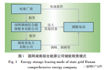 在工商業(yè)用戶市場,美國的AMS公司向用戶提供儲能租賃服務(wù)以幫助用戶節(jié)省電費支出。針對新能源消納空間不足以及新能源發(fā)電企業(yè)自配儲能困難的問題,國網(wǎng)湖南綜合能源公司于2020年11月發(fā)布儲能設(shè)備租賃招標公告,首創(chuàng)電池租賃模式,該運營模式如圖1所示。
