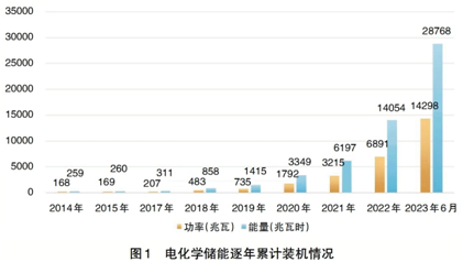 近年來,電化學(xué)儲能呈現(xiàn)爆發(fā)式增長,根據(jù)《統(tǒng)計數(shù)據(jù)》,2023年上半年,新增投運(yùn)電化學(xué)儲能電站227座、總功率7.41吉瓦、總能量14.71吉瓦時,新增規(guī)模創(chuàng)歷史新高,超過此前歷年累計裝機(jī)規(guī)??偤?見圖1)。此外,目前在建電化學(xué)儲能電站325座、總功率12.92吉瓦、總能量30.49吉瓦時,按照電化學(xué)儲能電站建設(shè)周期一般6~8個月計算,在不計新增項目的情況下,2023年下半年新增裝機(jī)規(guī)模也將翻一番,提前兩年完成“十四五”規(guī)劃裝機(jī)目標(biāo)(國家發(fā)改委、國家能源局《關(guān)于加快推動新型儲能發(fā)展的指導(dǎo)意見》中提到,2025年新型儲能裝機(jī)規(guī)模達(dá)3000萬千瓦以上)。