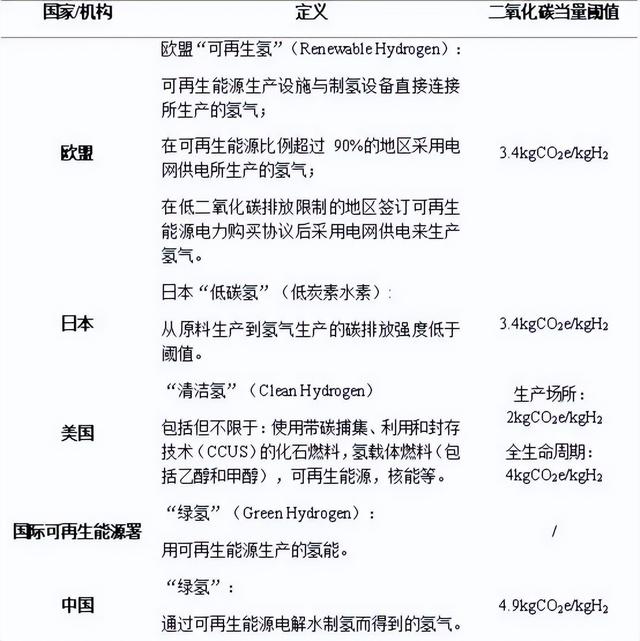 國際可再生能源署IRENA發(fā)布《“綠氫”政策制定指南2020》,其中定義“綠氫”,即用可再生能源生產(chǎn)的氫能。該指南提及最成熟的綠氫制備技術(shù)是基于可再生電能的水電解技術(shù),同時也提及了其他可再生能源制氫方案,包括生物質(zhì)氣化與裂解、熱化學(xué)水分解、光催化、生物質(zhì)超臨界水氣化等。國際可再生能源署對于生產(chǎn)每單位綠氫的二氧化碳當量沒有明確規(guī)定。