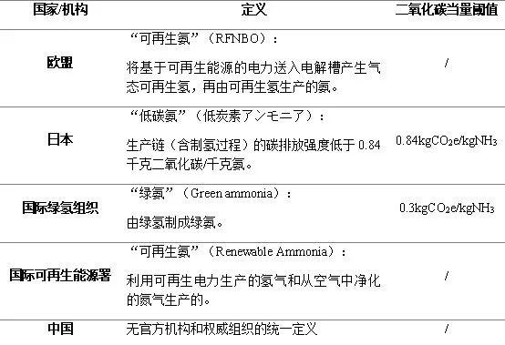 目前,國內(nèi)關(guān)于“綠氨”尚無官方機構(gòu)和權(quán)威組織的統(tǒng)一定義。行業(yè)內(nèi)具備相關(guān)發(fā)聲,國內(nèi)企業(yè)對綠氨的定義主要關(guān)注其原料氫是否由可再生能源電力制取,對生產(chǎn)過程中的碳排沒有明確的要求。