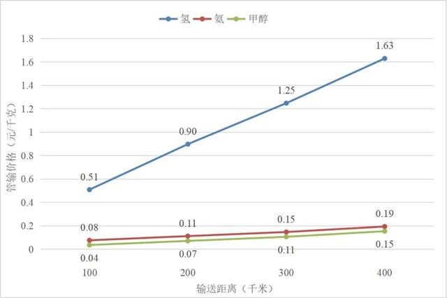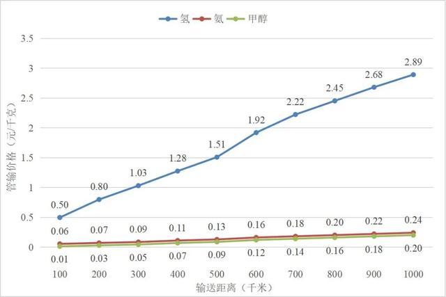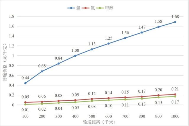 中期階段氫基能源長距離管輸價格與輸送距離的關(guān)系圖