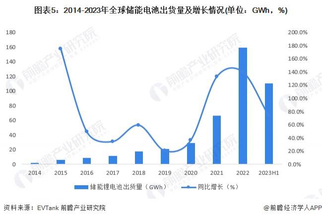 全球電化學(xué)儲(chǔ)能裝機(jī)規(guī)模的持續(xù)上漲帶動(dòng)儲(chǔ)能電池出貨量上漲,根據(jù) EVTank 披露的數(shù)據(jù),2014-2022 年,全球儲(chǔ)能電池 ( 主要為儲(chǔ)能鋰離子電池 ) 出貨量增長(zhǎng)速度較快,2022 年,全球儲(chǔ)能鋰離子電池總體出貨量為 159.3GWh,同比增長(zhǎng) 140.3%。2023 年上半年,全球儲(chǔ)能電池出貨量達(dá)到 110.2GWh,同比增長(zhǎng) 73.4%,