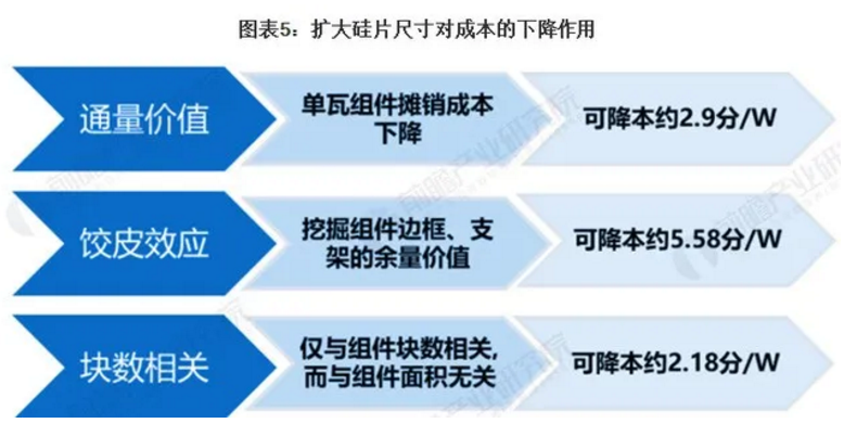 隨著硅片尺寸的擴(kuò)大,新型組件可以通過(guò)增加少量的硅片成本,獲得更高的組件端成本節(jié)約,進(jìn)而提升大尺寸組件的產(chǎn)品競(jìng)爭(zhēng)力。其降本機(jī)理為: