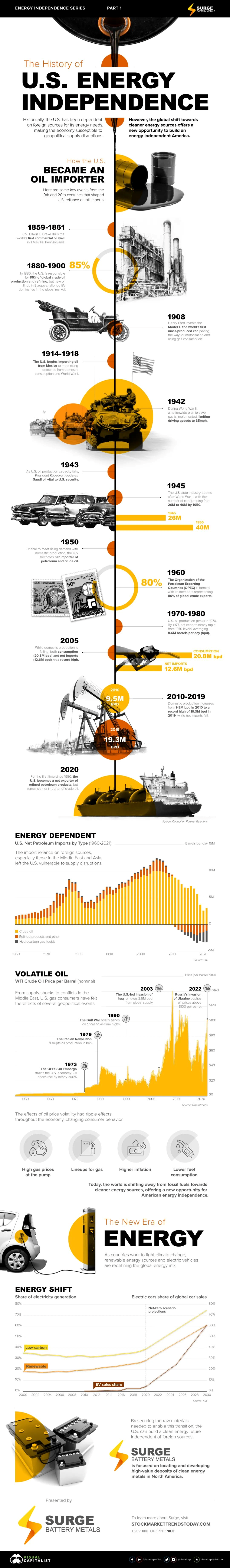 追求能源獨(dú)立長期以來一直是美國政治和外交政策的一部分,自20世紀(jì)70年代以來更是如此,但美國仍然經(jīng)常依賴石油進(jìn)口來滿足其不斷增長的需求。這種“能源對(duì)外依賴”使美國和美國消費(fèi)者很容易受到供應(yīng)中斷和油價(jià)沖擊的影響。Virtutal Capitalist網(wǎng)站發(fā)表信息圖,顯示美國如何能源進(jìn)口依賴的歷史。