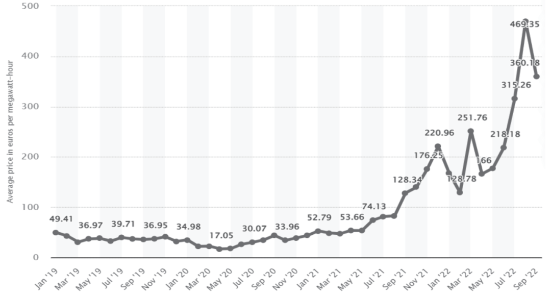 圖 2019—2022年德國電力批發(fā)價(jià)格月度走勢(shì)(單位:歐元/兆瓦時(shí))