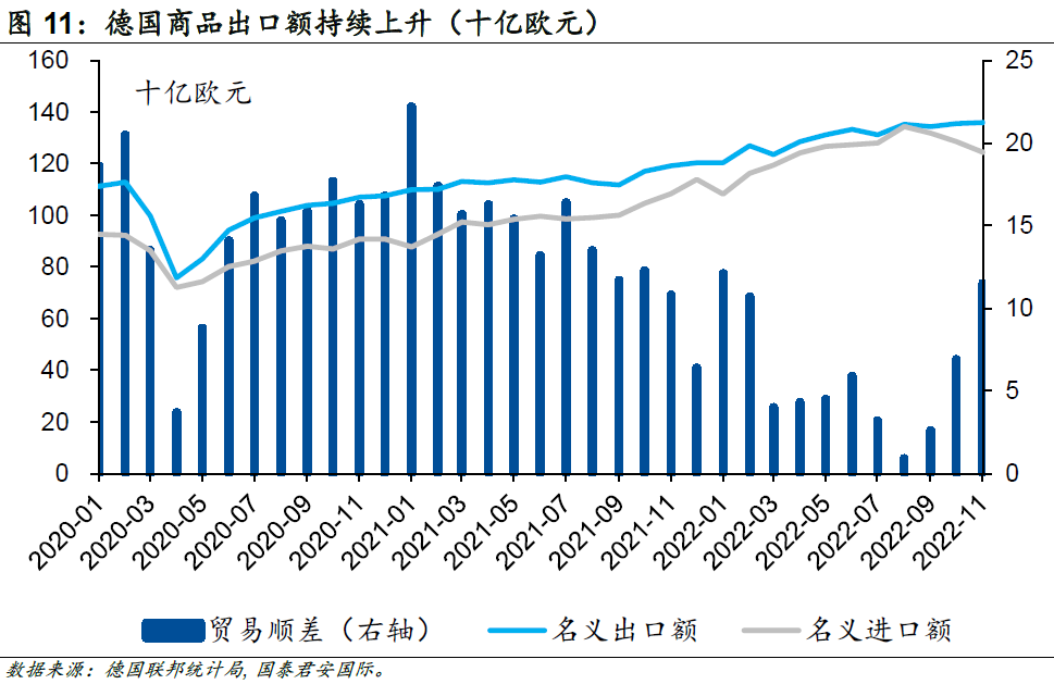 更加重要的是,為了應(yīng)對(duì)中長(zhǎng)期能源危機(jī),歐盟各國(guó)也開始加大對(duì)制造業(yè)的支持力度,制定了“能源系統(tǒng)數(shù)字化”計(jì)劃,該計(jì)劃預(yù)期在2030年前在基礎(chǔ)設(shè)施方面投資5,650億歐元,以大力發(fā)展光伏和新能源汽車產(chǎn)業(yè);除此以外,歐盟還加大了對(duì)液化天然氣產(chǎn)業(yè)的投資力度。德國(guó)作為歐洲經(jīng)濟(jì)的最重要組成部門,受益于政策支持,其工業(yè)生產(chǎn)并沒有受到太多能源問(wèn)題的干擾,尤其是核心的資本貨物出口額在衰退預(yù)期的背景下持續(xù)增長(zhǎng)。