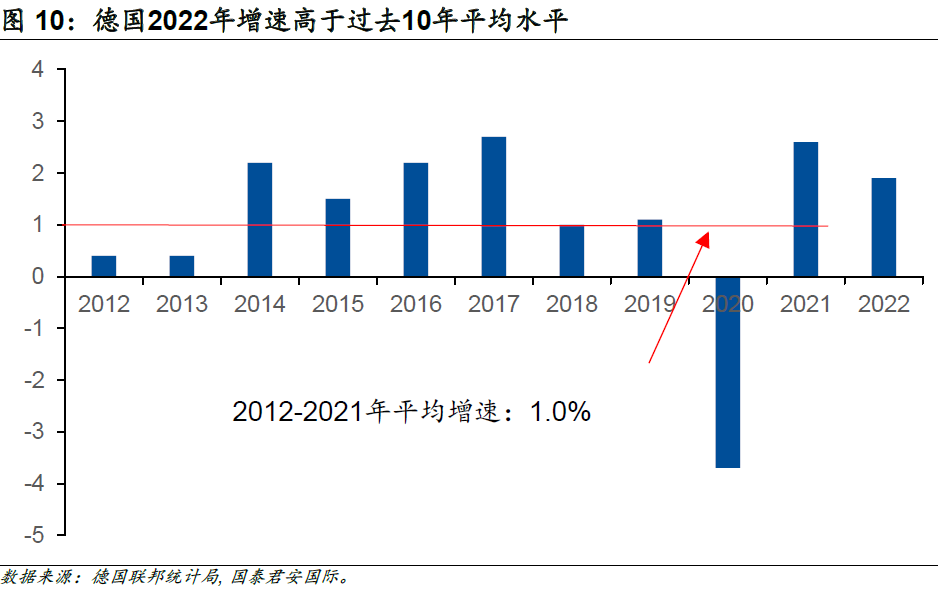作為歐元區(qū)最大的經(jīng)濟(jì)體,近日公布的數(shù)據(jù)顯示,經(jīng)過(guò)價(jià)格調(diào)整后,德國(guó)2022年GDP同比增長(zhǎng)1.9%,高于市場(chǎng)預(yù)期1.8%。不可否認(rèn)的是,俄烏沖突推升的天然氣價(jià)格給德國(guó)經(jīng)濟(jì)造成了相當(dāng)大的困擾,但是德國(guó)2022年GDP依舊增長(zhǎng)1.9%,較2019年(新冠疫情開始前一年)高0.7個(gè)百分點(diǎn),亦高于2012年至2021年的十年平均水平(1.0%)。
