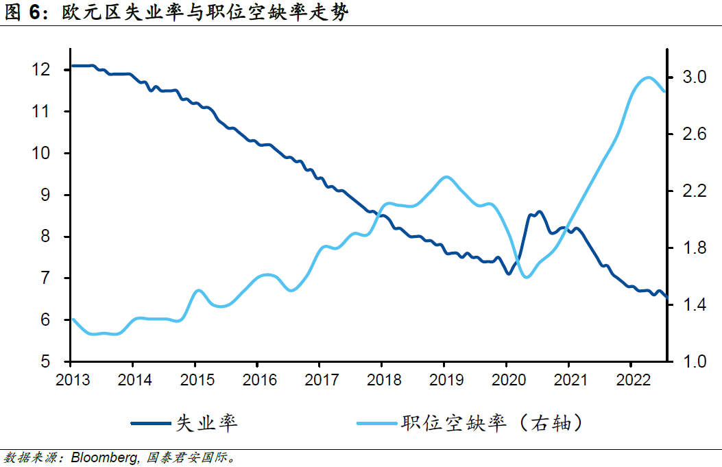 如果說(shuō)天氣在很大程度上幫助了歐洲人,但歐洲經(jīng)濟(jì)超預(yù)期的根本原因大概率不是因?yàn)樾疫\(yùn)或者天氣。進(jìn)一步來(lái)看,勞動(dòng)力市場(chǎng)的火熱意味著經(jīng)濟(jì)維持著較好的動(dòng)能。一方面,即使在能源價(jià)格高企的去年上半年,職位空缺率都處于上行趨勢(shì)中;另一方面,在緊張的企業(yè)用工環(huán)境中,歐元區(qū)的失業(yè)率開始走低,并迭創(chuàng)歷史低點(diǎn)。在之前通脹大幅高走的背景下,歐元區(qū)多個(gè)國(guó)家的工會(huì)已經(jīng)通過(guò)罷工的形式確定了未來(lái)的漲薪方案。與此同時(shí),歐洲央行(ECB)基于通脹補(bǔ)償?shù)目紤],在2022年12月的最新預(yù)測(cè)中將2022-2024年的累積工資增長(zhǎng)較2022年9月的預(yù)測(cè)值上調(diào)1.4個(gè)百分點(diǎn)。