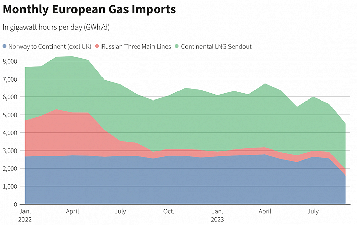 安迅思 (ICIS) 天然氣分析主管湯姆·馬澤克-曼瑟 (Tom Marzec-Manser)認(rèn)為:“歐洲已成功實(shí)現(xiàn)了對(duì)俄羅斯天然氣的替代,但實(shí)際上,這背后是以犧牲更廣泛的經(jīng)濟(jì)活動(dòng)作為代價(jià)的。”