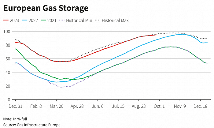 放在過去,沒有什么能夠比戰(zhàn)爭、罷工、停產(chǎn)這樣的突發(fā)事件更能影響能源等大宗商品價(jià)格的了。大宗商品商都會(huì)以此作為投資套利的工具。然而,即使罷工這樣的消息,也已經(jīng)無法動(dòng)搖經(jīng)歷過大風(fēng)大浪考驗(yàn)的歐洲天然氣的大勢。所以,《貿(mào)易經(jīng)濟(jì)學(xué)》同時(shí)指出,盡管天然氣價(jià)格出現(xiàn)短期上漲,但由于10月份天氣預(yù)測溫和、需求下降以及庫存水平較高,本周天然氣價(jià)格的整體趨勢顯示,下跌仍超過9%。目前,歐洲的儲(chǔ)氣設(shè)施容量已超過96%,并且仍在持續(xù)注入天然氣。另外,歐洲工業(yè)需求在不斷減少。以上這些都有助于維持相對(duì)穩(wěn)定的天然氣價(jià)格。