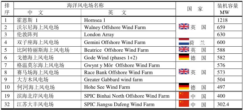 海洋最大的風(fēng)電場(chǎng)在英國(guó)倫敦陣列。中國(guó)最大的海上風(fēng)電場(chǎng)是濱海北岸風(fēng)電場(chǎng)(SPIC Binhai North Offshore Wind Farm),世界排序19,裝機(jī)容量400MW。SPIC是State Power Investment Corporation(國(guó)家電力投資公司)的縮寫。