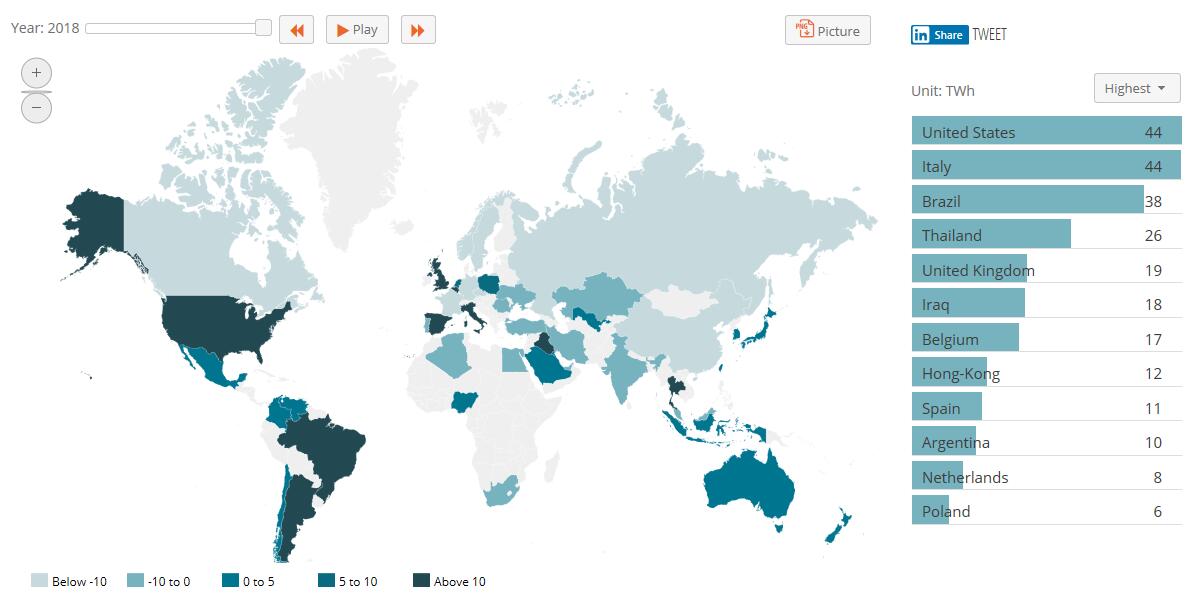 2018年全球電力進(jìn)口國(guó)的貿(mào)易量(單位:TWh)