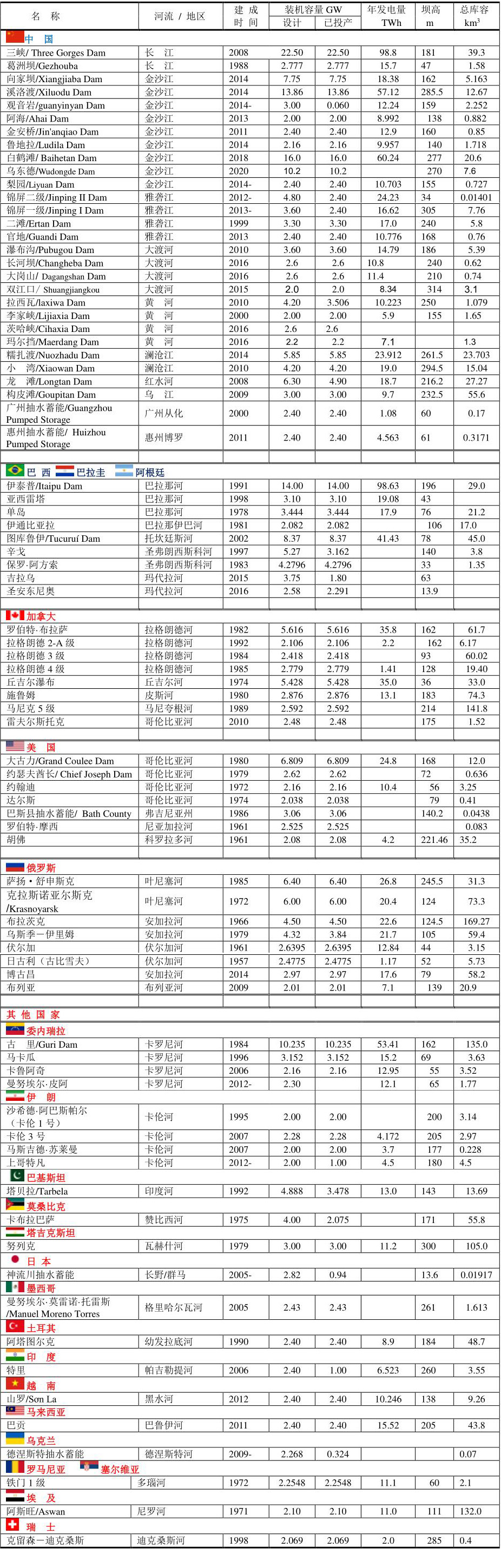 梯級(jí)水電站是世界上發(fā)展水力發(fā)電的一個(gè)重要的獲取電力的方式。在制作下表時(shí),我把相同一河流的水電站歸納在一起,您可以看出,世界上許多河流都是梯級(jí)水電站。