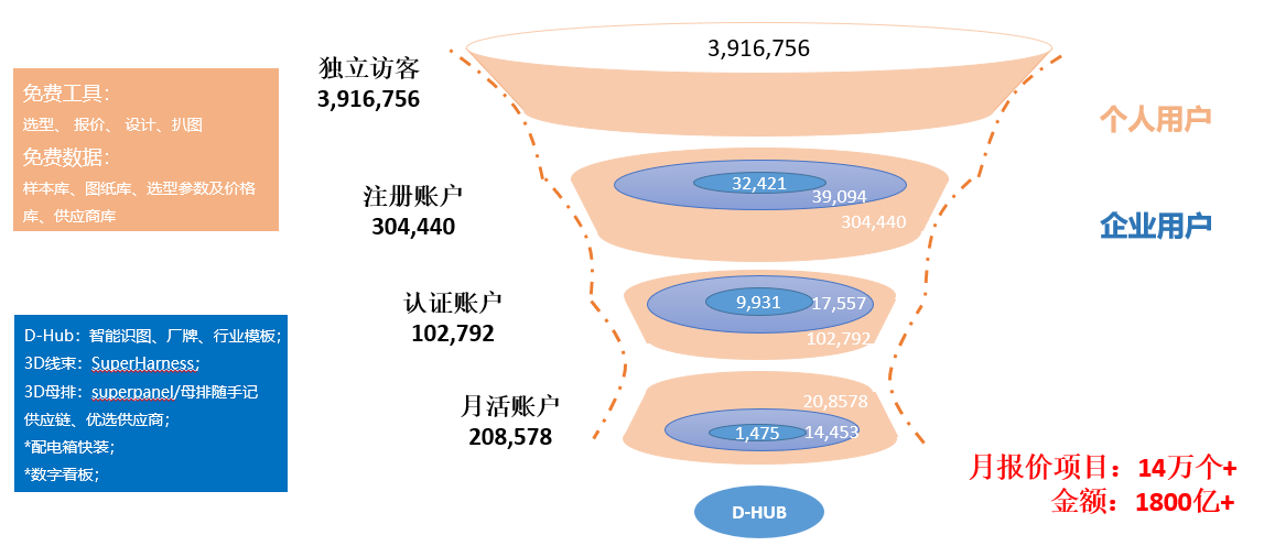 我們既然定下這個(gè)目標(biāo),就要一步一步來(lái)實(shí)施,做云端SaaS服務(wù),把原來(lái)的賣(mài)軟件的業(yè)務(wù)變成云服務(wù)。把我們?cè)瓉?lái)的報(bào)價(jià)軟件、設(shè)計(jì)軟件全部云端化并且共享一個(gè)數(shù)據(jù)庫(kù)。我們又做了選型軟件、生產(chǎn)安裝的軟件,目前正在開(kāi)發(fā)數(shù)字看板和數(shù)字工廠,所有的這些產(chǎn)品通過(guò)D-Hub是共享同一套數(shù)據(jù)庫(kù)。我們把原來(lái)離線的產(chǎn)品都變成在線,其中一部分軟件和數(shù)據(jù)免費(fèi)為用戶服務(wù),這些免費(fèi)的軟件和內(nèi)容吸引了大量的用戶,現(xiàn)在我們的獨(dú)立訪客有390萬(wàn)。當(dāng)然我們也有收費(fèi)的產(chǎn)品D-Hub。利馳已經(jīng)從一家CAD軟件公司轉(zhuǎn)變?yōu)樵诰€服務(wù)公司,我們其中的一個(gè)在線服務(wù)——電氣工程項(xiàng)目報(bào)價(jià)——最新的數(shù)據(jù)顯示一個(gè)月可以報(bào)14萬(wàn)個(gè)項(xiàng)目,總價(jià)值約1800億。