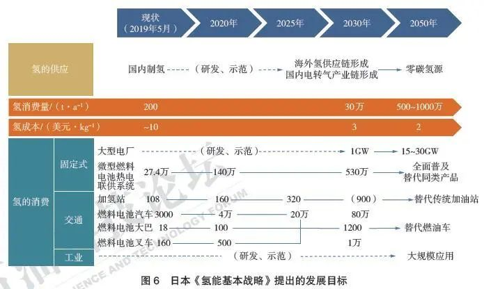 在能源消費方面,2012—2016年,日本能源消費總量減少了6.1%,接近實現(xiàn)2030年節(jié)能目標(biāo)所需的平均速度。日本能源轉(zhuǎn)型以氫能規(guī)?;脼轱@著特色和重要抓手,將氫能與電力和熱能并列定位為核心二次能源,并提出建設(shè)“氫能社會”的愿景,希望通過氫燃料電池實現(xiàn)氫能在家庭、工業(yè)、交通甚至全社會領(lǐng)域的應(yīng)用。日本在《氫能基本戰(zhàn)略》提出的主要發(fā)展目標(biāo)詳見圖6。