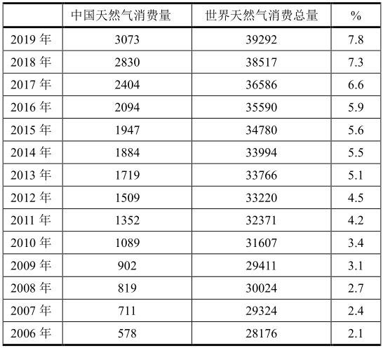 天然氣消費(fèi)量是指本國(guó)天然氣產(chǎn)量和進(jìn)口量之和。中國(guó)于2006年開始LNG國(guó)際貿(mào)易,2010年管輸國(guó)際貿(mào)易開始,因此從下表可以看出,2006年中國(guó)天然氣剛開始進(jìn)口,消費(fèi)量?jī)H占世界天然氣消費(fèi)總量的2.1%,但隨著LNG和管輸國(guó)際貿(mào)易以來,中國(guó)天然氣消費(fèi)量?jī)H占世界天然氣消費(fèi)總量的比例(%)逐年增加,到2019年中國(guó)天然氣消費(fèi)占世界消費(fèi)總量的比例已經(jīng)達(dá)到7.8%。