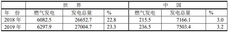 2019年全球燃?xì)獍l(fā)電占全球發(fā)電總量的份額為6297.9/27004.7=23.3%,而中國燃?xì)獍l(fā)電僅占本國發(fā)電總量的3.2%。