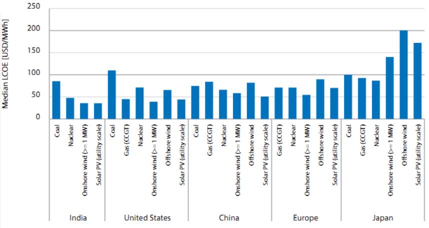 在中國(guó)和印度,風(fēng)電和光伏等間歇性可再生能源的平均平準(zhǔn)化發(fā)電成本最低,兩國(guó)的公用事業(yè)規(guī)模的太陽(yáng)能光伏發(fā)電和陸上風(fēng)電成本最低。核電也具有競(jìng)爭(zhēng)力,這表明兩國(guó)都擁有從當(dāng)前仍然高度碳密集的發(fā)電中轉(zhuǎn)型到低碳發(fā)電的基礎(chǔ)。