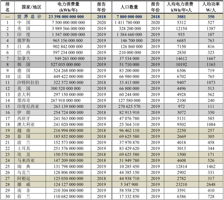 電力消費(fèi)最高的前30個(gè)國(guó)家
