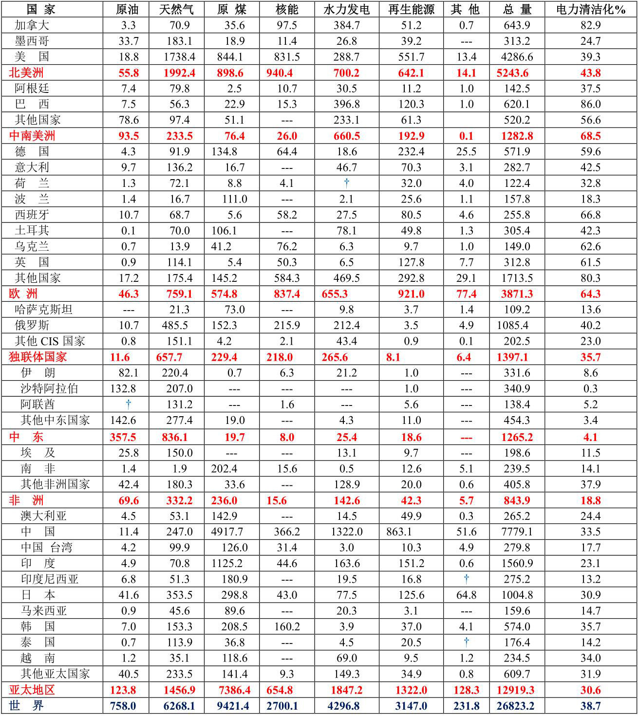 從表中可以看出:全球電力清潔化程度平均值為38.7%;電力清潔化程度最高的地區(qū)是中南美洲達(dá)68.5%;電力清潔化程度最高的國(guó)家是巴西(86%)、加拿大(82.9%)。