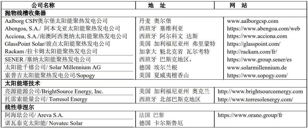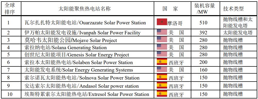 較大的CSP的項目是在美國的伊萬帕太陽能發(fā)電設(shè)施(Ivanpah Solar Power Facility),它使用392 MW太陽能發(fā)電塔技術(shù),無需熱能儲存,然而瓦爾扎扎特太陽能發(fā)電站在摩洛哥,相結(jié)合的槽和塔技術(shù)總計 510 MW,具有數(shù)小時的能量存儲,居世界第一。