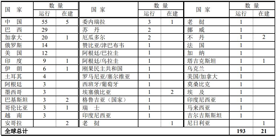 就目前而論,世界各國裝機(jī)容量在1000MW以上的運(yùn)行水電站數(shù)為193座,在建的友21座。其中中國運(yùn)行的裝機(jī)容量在1000MW以上的水電站數(shù)達(dá)55座,在建的有5座,均居全球首位。