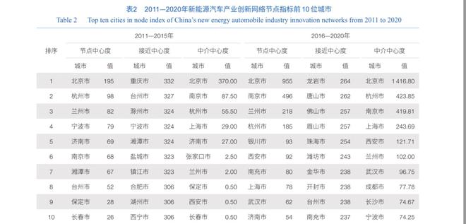 北京市、上海市和其他省會城市、首府城市是中國新能源汽車產(chǎn)業(yè)創(chuàng)新網(wǎng)絡(luò)中的核心節(jié)點,并具有引導(dǎo)其他城市共同開展新能源汽車專利合作的能力。由表2可知,北京市節(jié)點中心度自2011年以來始終是中國新能源汽車產(chǎn)業(yè)創(chuàng)新網(wǎng)絡(luò)中各城市的最高值,并且遠高于其他城市。這反映出北京市不僅在數(shù)量上擁有最多的新能源汽車產(chǎn)業(yè)專利,同時相對于其他城市,還與創(chuàng)新網(wǎng)絡(luò)中更多其他的節(jié)點城市開展了新能源汽車的創(chuàng)新合作。北京市在中介中心度上自2011年以來也保持著遠高于其他節(jié)點城市的數(shù)值。這反映了在新能源汽車產(chǎn)業(yè)創(chuàng)新網(wǎng)絡(luò)中,北京市擁有遠高于其他城市的在聯(lián)合其他兩個及兩個以上城市共同開展研發(fā)活動的能力。上海市的節(jié)點中心度和中介中心度自2011年以來上升顯著。同時,杭州市和南京市等其他長江三角洲城市群地區(qū)的城市也具有較高的節(jié)點中心度和中介中心度。結(jié)合圖1可知,在長江三角洲城市群地區(qū),上海市同其他城市已經(jīng)形成了復(fù)雜的新能源汽車產(chǎn)業(yè)創(chuàng)新網(wǎng)絡(luò),同樣具有聯(lián)合其他兩個及兩個以上城市共同開展研發(fā)活動的能力。此外,相較于2011—2015年,2016—2020年的節(jié)點中心度和中介中心度排名前10名的城市中省會城市和首府城市顯著增多,這是由于省會城市和首府城市在省內(nèi)和自治區(qū)內(nèi)通常擁有更多的政策傾斜和更為豐富的企業(yè)、科研資源。隨著參與到中國新能源汽車產(chǎn)業(yè)創(chuàng)新網(wǎng)絡(luò)中的城市逐漸增多,省會城市和首府城市更有能力與率先開展新能源汽車研發(fā)的城市開展合作,或者自主開展并引導(dǎo)其他鄰近城市參與新能源汽車的研發(fā)活動。
