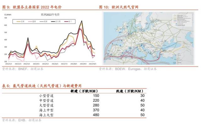 Ø 運(yùn)氫、應(yīng)用環(huán)節(jié)基礎(chǔ)設(shè)施領(lǐng)先,經(jīng)濟(jì)性更優(yōu):歐盟目前擁有成熟的天然氣發(fā)電體系,現(xiàn)有燃?xì)廨啓C(jī)經(jīng)改造可以使用純氫/摻氫發(fā)電,節(jié)約發(fā)電設(shè)備投資。同時(shí),依托現(xiàn)有發(fā)達(dá)的天然氣運(yùn)輸管網(wǎng),改造成具備運(yùn)氫能力的管道費(fèi)用遠(yuǎn)低于新建;