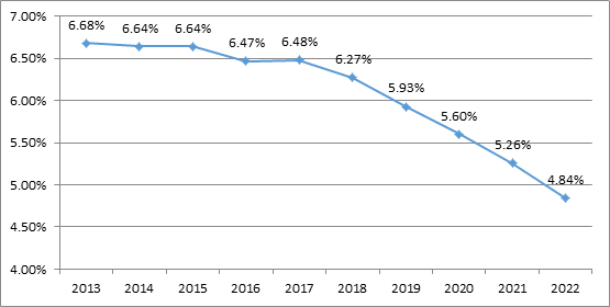 據(jù)中電聯(lián)快報數(shù)據(jù),2022年全國線損率4.84%,同比下降0.42個百分點,保持繼續(xù)下降走勢,較2013年下降了1.84個百分點。