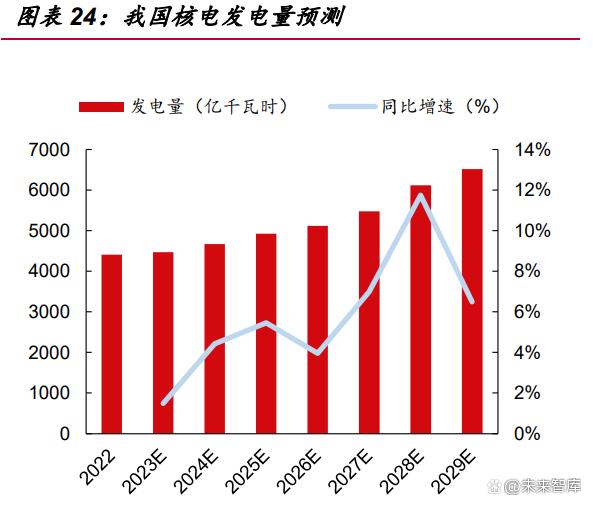 核電逐漸成為我國(guó)發(fā)電端的重要一環(huán)。根據(jù)中電聯(lián)預(yù)計(jì),2023 年我國(guó)經(jīng)濟(jì)運(yùn)行 有望總體回升,拉動(dòng)電力消費(fèi)需求增速比 2022 年有所提高。正常氣候情況下,預(yù)計(jì) 2023 年全國(guó)全社會(huì)用電量 9.15 萬(wàn)億 kWh,比 2022 年增長(zhǎng) 6%左右。預(yù)計(jì) 2023 年 底全國(guó)發(fā)電裝機(jī)容量 28.1 億 kW 左右,其中核電 5846 萬(wàn) kW。根據(jù)中國(guó)核能行業(yè)協(xié) 會(huì)預(yù)計(jì),2035 和 2060 年,核能發(fā)電量在我國(guó)電力結(jié)構(gòu)中的占比分別需要達(dá)到 10% 和 20%左右,與當(dāng)前 OECD 國(guó)家的平均水平相當(dāng)。 核電裝機(jī)維持合理速度增長(zhǎng)。我們對(duì)現(xiàn)有在運(yùn)、在建、核準(zhǔn)項(xiàng)目進(jìn)行測(cè)算,由于 2016-2018 年沒(méi)有新項(xiàng)目核準(zhǔn),因此 2023-2026 年我國(guó)核電裝機(jī)增速相對(duì)減緩,同 時(shí)由于 2019-2022 年恢復(fù)正常核準(zhǔn)且 2022 年核準(zhǔn)達(dá) 10 臺(tái)機(jī)組,因此核電裝機(jī)有望 在 2027-2029 年達(dá)到小高潮,至 2029 年底達(dá) 8365.7 萬(wàn) kW,2023-2029 年七年我 國(guó)核電裝機(jī) CAGR 達(dá) 6.0%。根據(jù)我國(guó)核電建設(shè)進(jìn)度,以及法國(guó)按照電力結(jié)構(gòu) PPE 計(jì)劃每年關(guān)閉同等數(shù)量的核電機(jī)組,我國(guó)在運(yùn)核電機(jī)組數(shù)量預(yù)計(jì)在 2024 年超過(guò)法國(guó) 達(dá)到世界第二位。