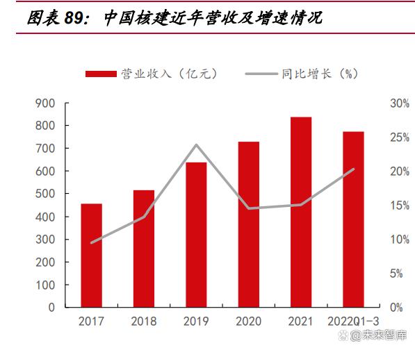 中國核建成立于 2010 年,于 2016 年上市,主營業(yè)務(wù)為核電工程、工業(yè)和民用 工程建設(shè),2018 年中核建設(shè)集團(tuán)與中核集團(tuán)實(shí)行戰(zhàn)略重組推動企業(yè)改革。公司正高 水平推進(jìn) “國際熱核聚變實(shí)驗(yàn)堆”項(xiàng)目建設(shè),已成功實(shí)現(xiàn)主機(jī)安裝第一階段任務(wù),國際 品牌影響力顯著提升。公司 2022 年非公開發(fā)行募集資金約 25 億元投入建筑工程項(xiàng) 目,拓寬民用工程業(yè)務(wù)布局。 2022 年公司收入穩(wěn)健增長,2022 年前三季度公司實(shí)現(xiàn)營業(yè)收入 772.8 億元,同 比上升 20.3%,歸母凈利潤 12.8 億元,同比上升 22.8%。根據(jù)公司經(jīng)營情況簡報(bào), 2022 年全年?duì)I業(yè)收入 981.4 億元,同比上升 17.2%,據(jù)此計(jì)算,2022 年第四季度營 業(yè)收入 208.6 億元,同比上升 7.2%。訂單方面,公司 2022 年前三季度累計(jì)新增訂 單 995.2 億元,同比提升 2%,根據(jù) 2022 年 12 月發(fā)布的公開投資者調(diào)研情況公告披 露,2022 年全國共核準(zhǔn) 10 臺核電機(jī)組,8 臺已完成招投標(biāo),公司全部參與且全部中 標(biāo),剩余 2 臺仍在投標(biāo)前期階段,公司有望憑借高資質(zhì)、豐富的建造經(jīng)驗(yàn),持續(xù)中標(biāo) 核島工程訂單。