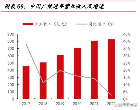 中國廣核是中國廣核集團(tuán)的核電運(yùn)營上市主體,主營業(yè)務(wù)為建設(shè)、運(yùn)營及管理核 電站,銷售核電站所發(fā)電力,組織開發(fā)核電站的設(shè)計(jì)及科研工作。截至 2022 年,公 司管理 26 臺在運(yùn)和 7 臺在建核電機(jī)組,裝機(jī)容量分別為 29.38GW 和 8.36GW,在 運(yùn)核電機(jī)組容量占全國在運(yùn)總裝機(jī)容量的 51.91%,是我國最大的純核電運(yùn)營商。 2022 年公司發(fā)電量同比下降,主要原因?yàn)闄z修時間較 2021 年同期增長,臺山1、2 號機(jī)組換料大修拖累公司 2022 年的電量表現(xiàn),公司整體 2022 年發(fā)電量下滑 1.38%(包括聯(lián)營企業(yè)),但公司全年?duì)I收及凈利潤等業(yè)績表現(xiàn)依然實(shí)現(xiàn)了小幅增長。 公司 2022 年?duì)I業(yè)收入 828.2 億元,同比增長 2.7%,歸母凈利潤 99.6 億元,同比增 長 2.1%。