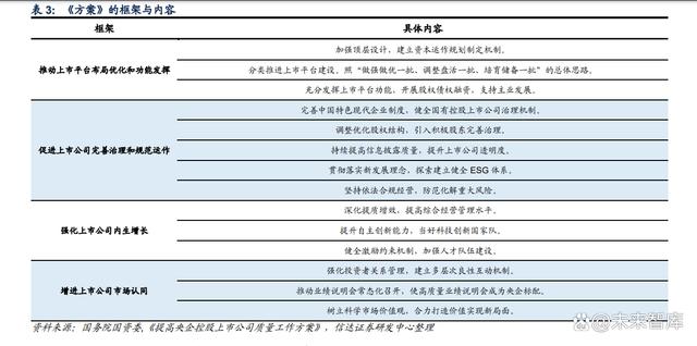 在 2022 年,《國(guó)企改革三年行動(dòng)方案》的收官之年,國(guó)資委提出了《提高央企控股上市公 司質(zhì)量工作方案》(下稱《方案》),這開啟了新一輪的央企改革?!斗桨浮访鞔_了提高央 企上市公司質(zhì)量的指導(dǎo)思想和整體思路,要求中央企業(yè)要做好三個(gè)方面的統(tǒng)籌平衡,即堅(jiān)持 做優(yōu)存量與做精增量結(jié)合;堅(jiān)持價(jià)值創(chuàng)造與價(jià)值實(shí)現(xiàn)兼顧;堅(jiān)持依法合規(guī)與改革創(chuàng)新并重。 《方案》從推動(dòng)上市平臺(tái)布局優(yōu)化和功能發(fā)揮、促進(jìn)上市公司完善治理和規(guī)范運(yùn)作、強(qiáng)化上 市公司內(nèi)生增長(zhǎng)和創(chuàng)新發(fā)展、增進(jìn)上市公司市場(chǎng)認(rèn)同和價(jià)值實(shí)現(xiàn)等四個(gè)實(shí)施方面,提出 14 項(xiàng)具體工作舉措。