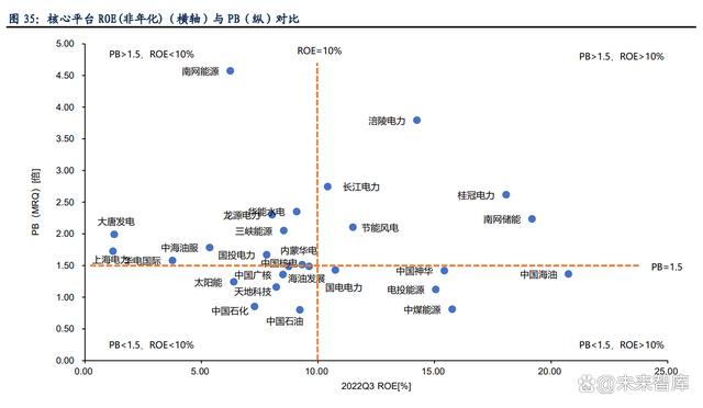 在 PB-ROE 模型中,全部 A 股上市公司的數(shù)據(jù)如下:2023/3/30 的 PB 為 1.57(MRQ), 2022 前三季度 ROE 為 8.99%。因此,我們將 PB=1.5,roe =10%作為標(biāo)準(zhǔn)進(jìn)行篩選,對 PB 估值較低且資產(chǎn)收益率較高的核心平臺(tái)分為以下三類: (1) 第一類,ROE 大于 10%且 PB 小于 1.5 的公司:中煤能源,中國海油,中國神華, 電投能源,國電電力。 (2) 第二類,PB 略大于 1.5 但 ROE 表現(xiàn)良好的公司:節(jié)能風(fēng)電。 (3) 第三類,ROE 略低于 10%且 PB 較低的公司:中國石油,中國廣核,中國石化,海 油發(fā)展,天地科技,中國核電。 從中長期來看,二級市場對股票的估值水平通常會(huì)隨著公司盈利能力的增強(qiáng)而上升,即 PB 與 ROE 理論上應(yīng)當(dāng)呈現(xiàn)正相關(guān)關(guān)系。我們認(rèn)為,以上公司是目前處于低估狀態(tài)的能源央企 核心平臺(tái),估值修復(fù)空間較大。