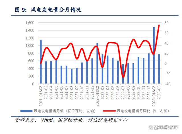 結構方面,2023Q1 第一產(chǎn)業(yè)用電量同比增長 9.7%,第二產(chǎn)業(yè)用電量同比增長 4.2%,第三產(chǎn)業(yè)用電量同比增長 4.1%,而城鄉(xiāng)居民生活用電量同比增長僅 0.2%(一二三產(chǎn)及居民 生活用電占全社會用電量的比重分別為 1.25%、65.17%、17.43%、16.15%),居民生活 用電的低增長拖累一季度整體用電量的增速。從電力消費彈性系數(shù)來看,2022 年度全社會 用電量增速為 3.6%,GDP 增速為 3%,電力消費彈性系數(shù)達到 1.2;然而受居民生活用電 2023Q1 增速大幅放緩的影響,2023Q1 我國在實現(xiàn) 4.5%的 GDP 增速同時,用電量增速僅 3.6%,電力消費彈性系數(shù)下降至 0.8。 其中,1-2月一、二、三產(chǎn)業(yè)和城鄉(xiāng)居民生活用電量分別同比變化6.64%、3.48%、-0.11%、 2.75%,而 3 月單月的一、二、三產(chǎn)業(yè)和城鄉(xiāng)居民生活用電量分別同比變化 18.65%、 6.67%、14.04%、-5.76%。3 月以來開工復蘇潮表現(xiàn)明顯,二產(chǎn)用電增速穩(wěn)中向好,三產(chǎn) 用電增速大幅反彈,但 3 月份居民生活用電同比下降 5.76%,相較于去年同期(2022 年 3 月)高達 8.92%的居民生活用電增速,降幅高達 14.68pct。暖冬對于居民生活用電影響較 大,2 月下旬至 3 月上旬,我國中東部地區(qū)氣溫明顯升高,相比常年同期偏暖。